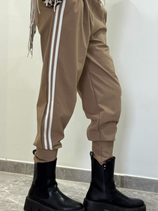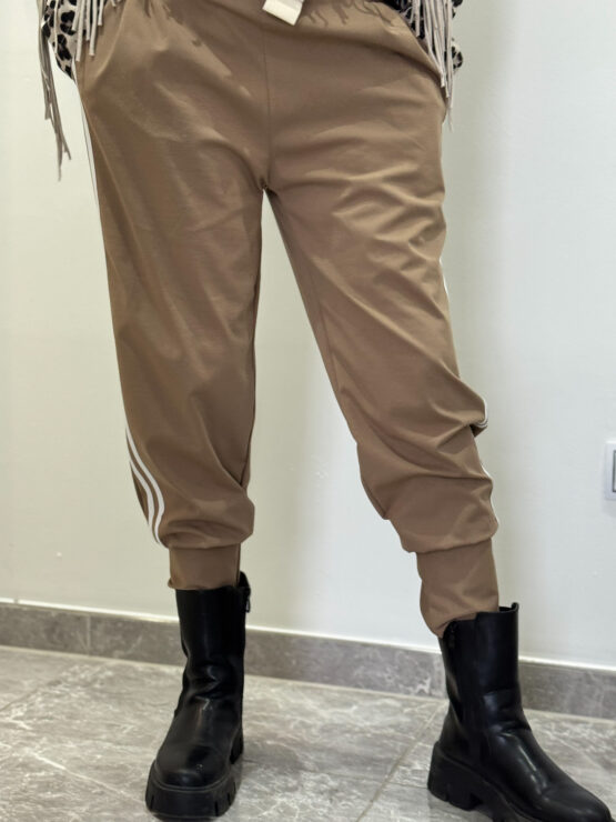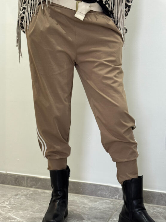 Schlupf Hose mit rundum Gummibund und Sisal Gürtel. Seitlich mit Streifen Design und breiten Bündchen