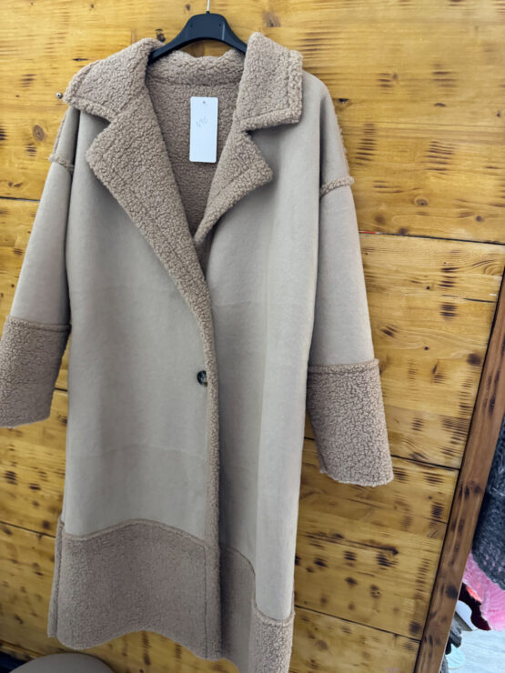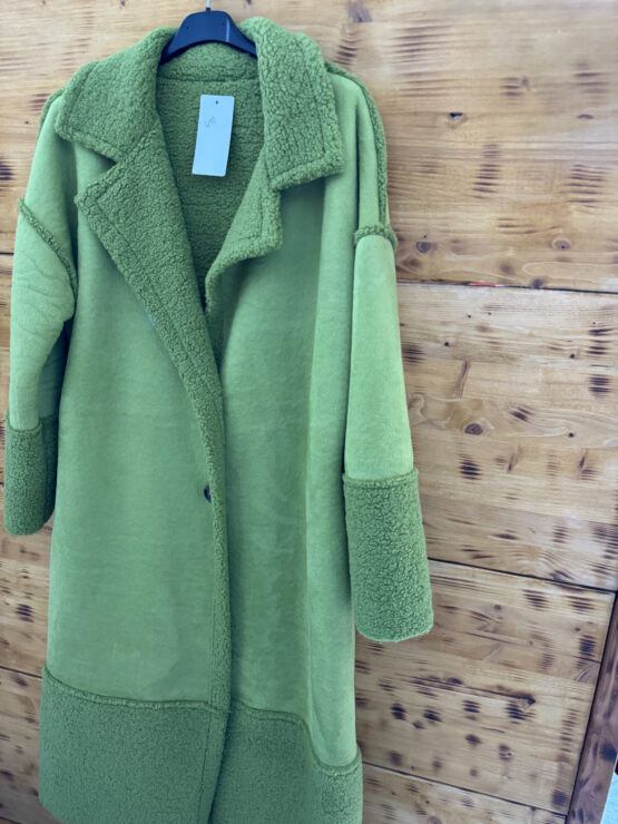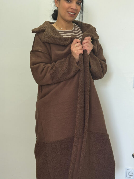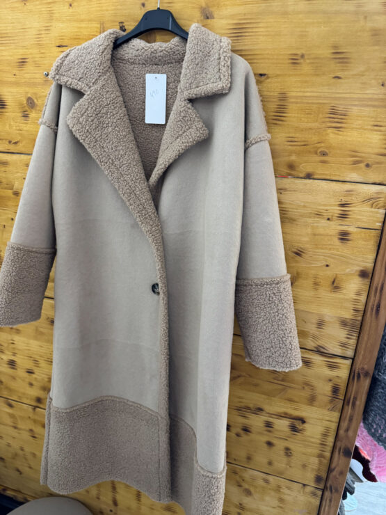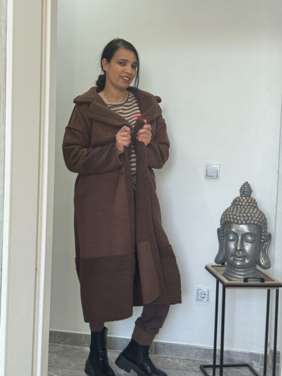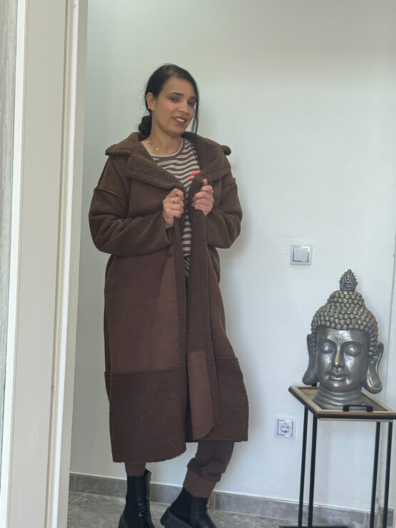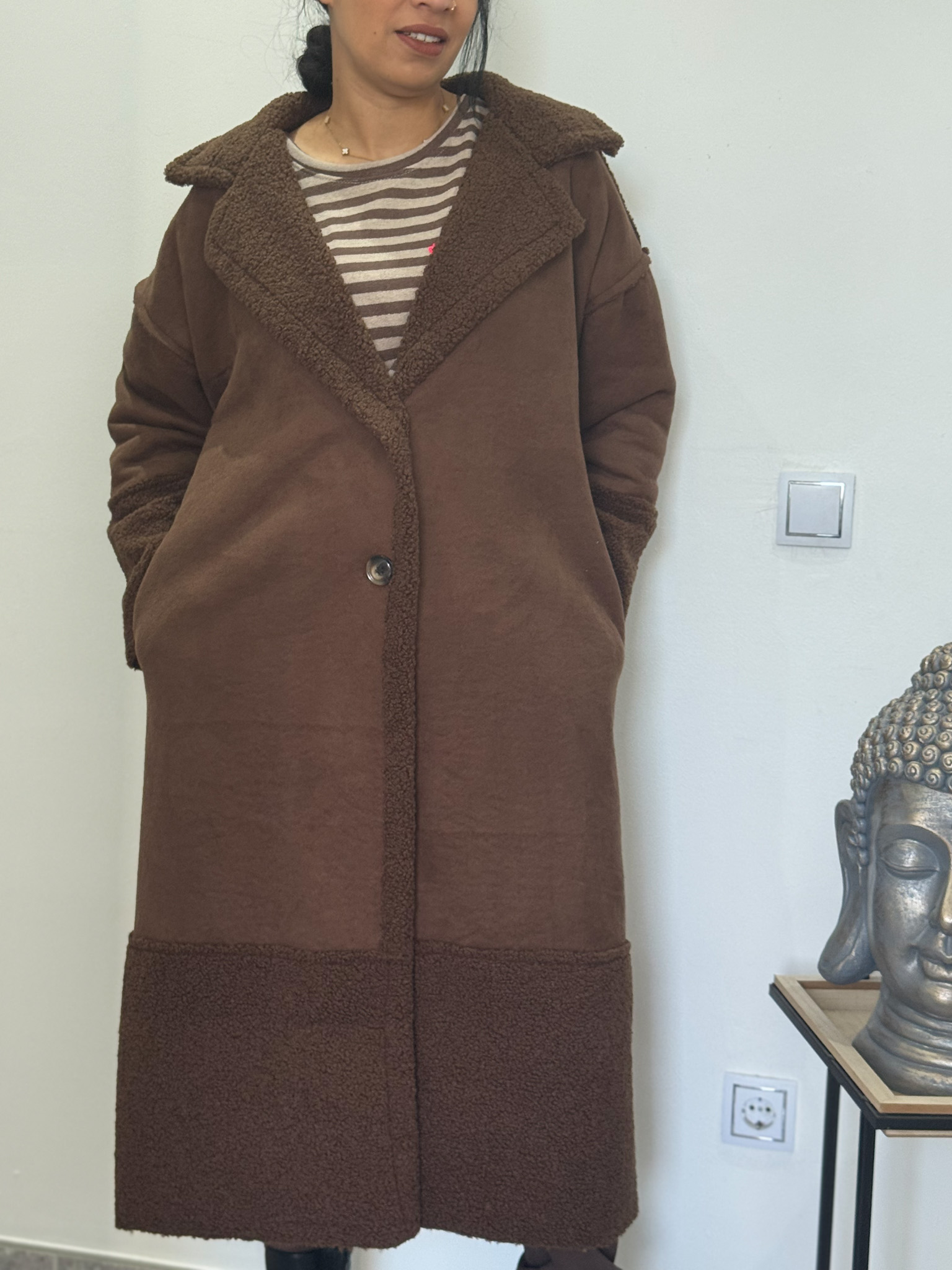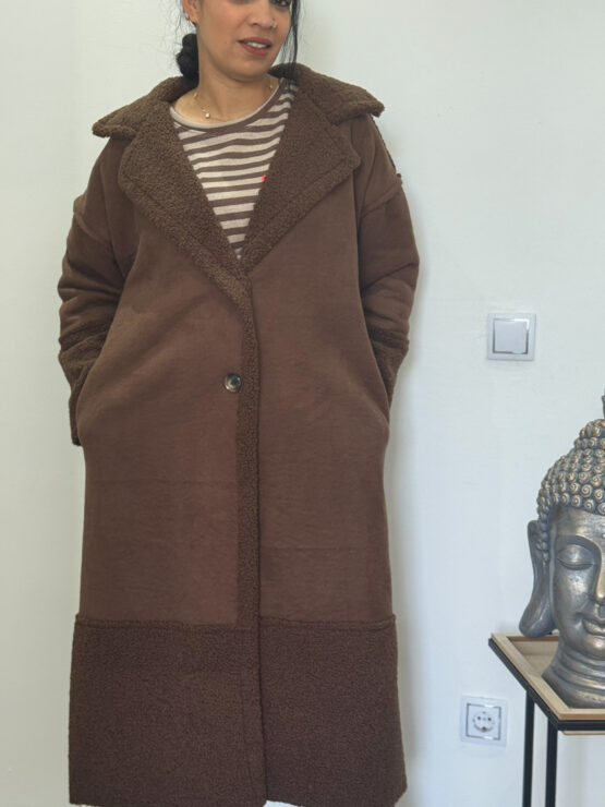 Lang Mantel innen Futter aus Teddy Stoff , Eingriff Taschen vorne mit Knöpfen zu schließen