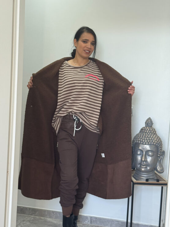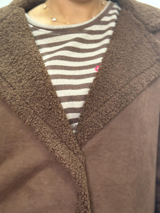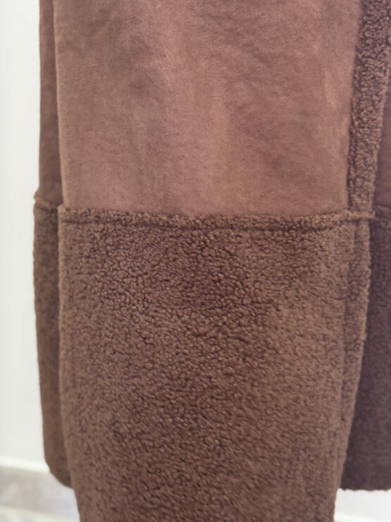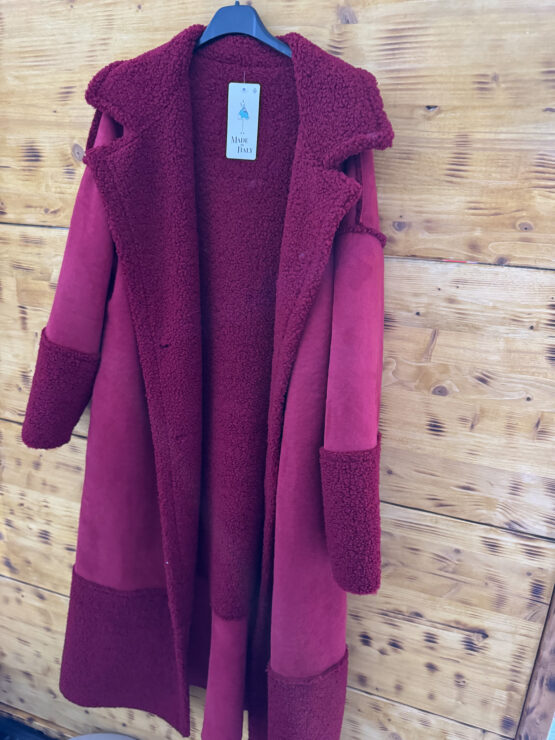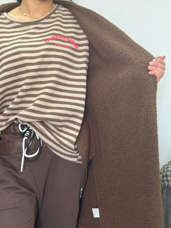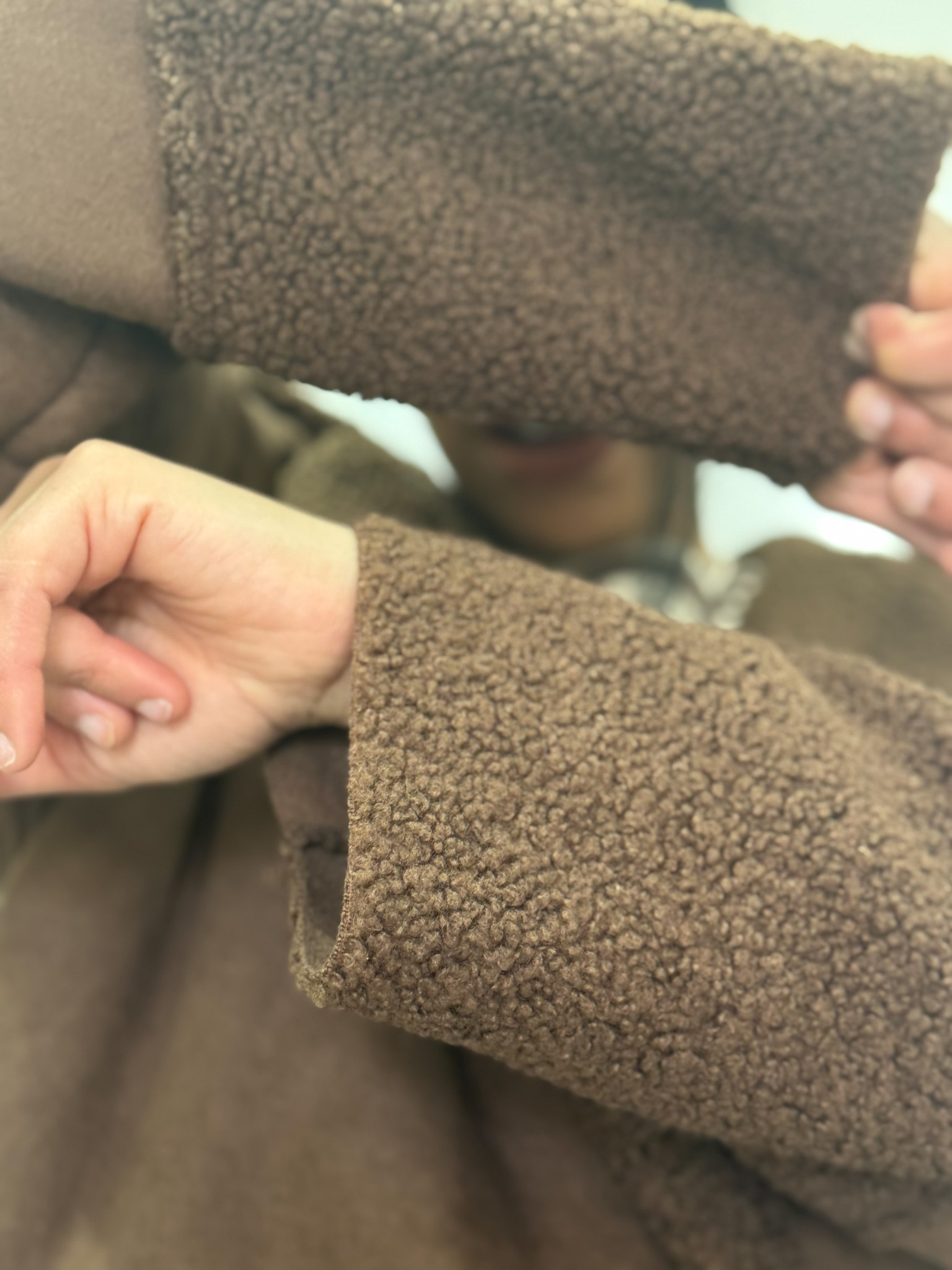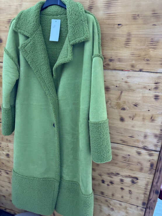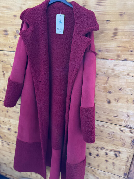 Lang Mantel innen Futter aus Teddy Stoff , Eingriff Taschen vorne mit Knöpfen zu schließen